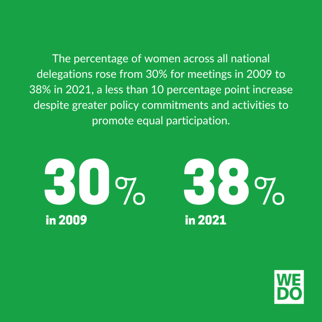The percentage of women across all national delegations rose from 30% for meetings in 2009 to 38% in 2021, a less than 10 percentage point increase despite greater policy commitments and activities to promote equal participation.